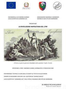 Venerdì 29 novembre, alle ore 9.30 presso ’Auditorium “Giorgio Amico” del Liceo Scientifico “Leonardo Leo” di San Vito dei Normanni,j si terrà una conferenza-dibattito sulla Repubblica Napoletana del 1799 di cui ricorre il 220° anniversario.