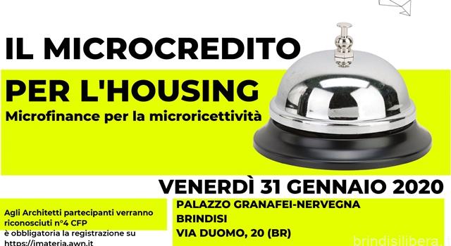 Si svolgerà a Brindisi venerdì 31 Gennaio, dalle ore 15.30 alle ore 19:00, presso la Sala Universitaria di Palazzo Granafei Nervegna, l’incontro organizzato dall’Ordine degli Architetti PPC di Brindisi e dalla Federazione Regionale degli Architetti di Puglia, per presentare l’accordo sinergico siglato tra il Consiglio Nazionale degli Architetti Pianificatori Paesaggisti e Conservatori e l’Ente Nazionale per il Microcredito, per l’attivazione di progetti di microcredito finalizzato all’ “Housing Microfinance per la Microricettività”.