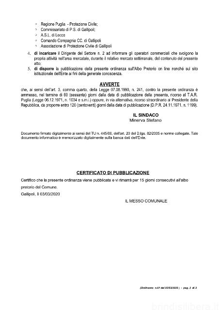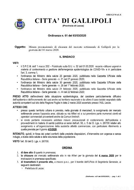 Con ordinanza del n. 61 del 3 marzo 2020 “Emergenza COVID-19 (Coronavirus)”, il Sindaco del comune di Gallipoli ha disposto la chiusura del mercato settimanale di via Alfieri nel giorno 4 marzo 2020. Una decisione, quella del Sindaco Minerva, che ha immediatamente suscitato la reazione della Categoria degli Ambulanti che ora sono seriamente preoccupati per quanto possa derivare su scala pugliese e nazionale.