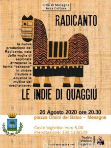 Si svolgerà mercoledì 26 agosto alle ore 20.30 in piazza Orsini del Balzo il concerto dei Radicanto. Il gruppo musicale eseguirà il repertorio dell’ultimo lavoro discografico, “Le Indie di Quaggiù”. L’evento – promosso dall’Amministrazione comunale, Area Cultura, in collaborazione col Teatro Pubblico Pugliese – si inserisce nella rassegna estiva patrocinata dal Comune di Mesagne.