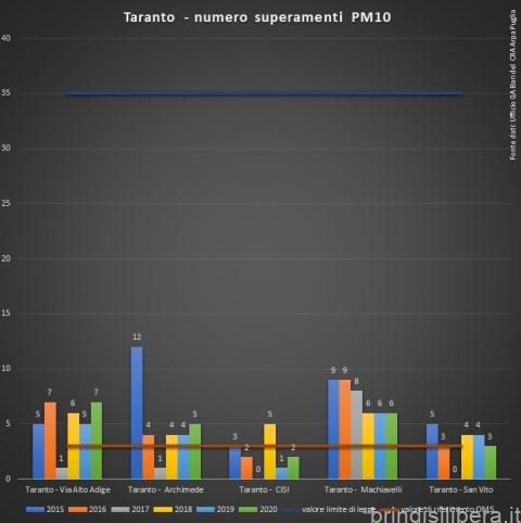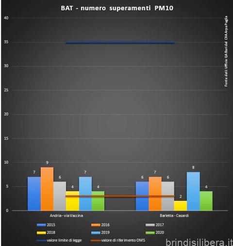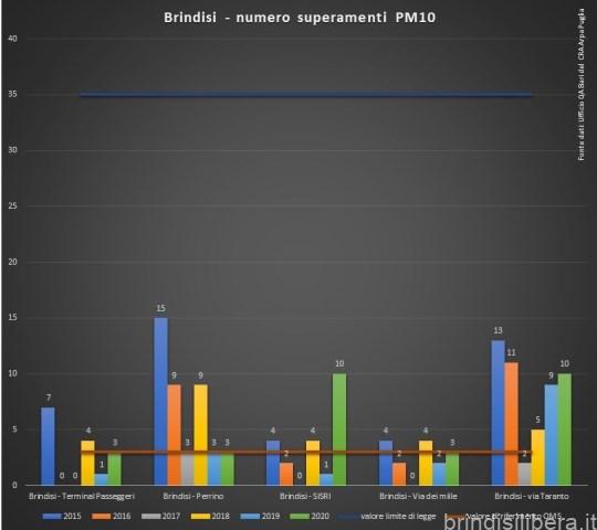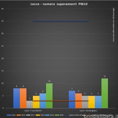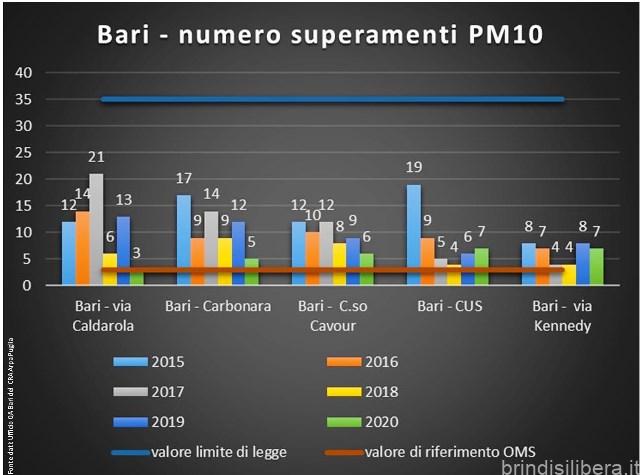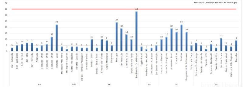 Nella figura sottostante si riportano i superamenti registrati nel 2020 dalle centraline da traffico ed industriali della rete regionale. La stazione di monitoraggio Torchiarolo-Don Minzoni, come negli anni precedenti, ha registrato il maggior numero di superamenti (33).