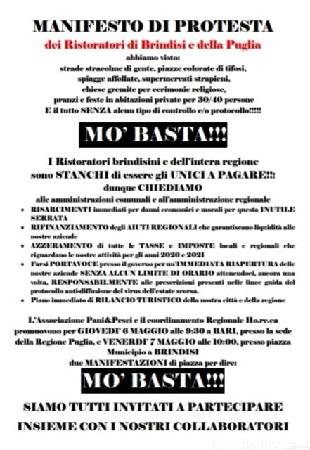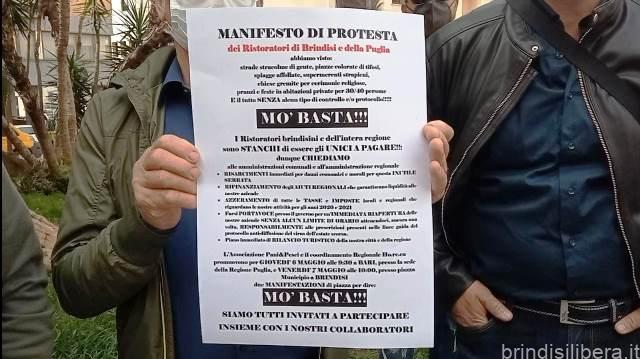 Le istanze, già evidenziate nei giorni precedenti la manifestazione, erano state illustrate in un manifesto diffuso proprio dall’associazione e consistevano in un rifinanziamento degli aiuti regionali per garantire liquidità alle aziende, nell’azzeramento di tutte le tasse e le imposte locali e regionali relative alle attività per gli anni 2020/21, nella possibilità che i comuni e la regione si facessero portavoce presso il Governo di una immediata riapertura delle aziende di ristorazione senza alcun limite di orario e ancora una volta responsabilmente con il rispetto delle prescrizioni presenti nelle linee guida del Protocollo antidiffusione del virus dell’estate 2020 ed infine nella redazione di un piano immediato di rilancio turistico della città di Brindisi dove le opinioni e le idee della Associazione potessero essere considerate come integrazione in un percorso condiviso. Nel corso della mattinata, quindi gli assessori Vitali e Pinto hanno invitato i ristoratori in comune per poter discutere su richieste e opportunità offerte dall’Amministrazione Comunale. Durante il confronto sono stati affrontati gli argomenti e gli