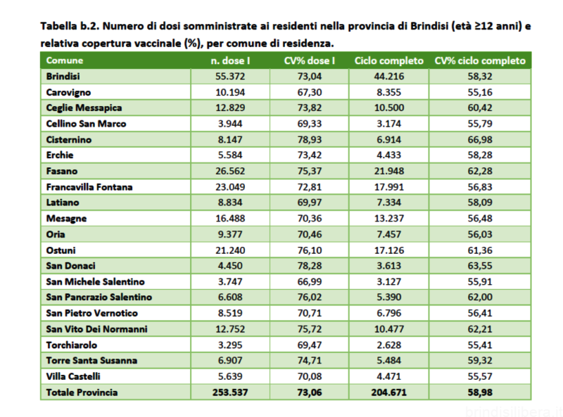 Fino al 29 luglio i residenti o domiciliati in provincia di Brindisi vaccinati con la prima dose sono 253.537 e di questi 204.671 con la seconda dose, con una copertura vaccinale pari rispettivamente al 73,1% e al 59%.
