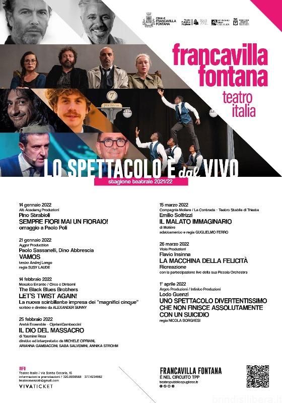 Ricchissimo il cartellone programmato dall’Amministrazione Comunale in collaborazione con il Teatro Pubblico Pugliese con sette spettacoli che vedranno calcare il palco del Teatro Italia da interpreti di primo piano della scena nazionale come Emilio Solfrizzi, Flavio Insinna, Paolo Sassanelli, Dino Abbrescia, Lodo Guenzi e Pino Strabioli.