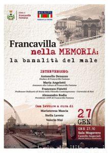 “Se comprendere è impossibile, conoscere è necessario, perché ciò che è accaduto può ritornare.” La celebre riflessione di Primo Levi incarna lo spirito dell’iniziativa “Francavilla nella Memoria: la banalità del male” in programma giovedì 27 gennaio alle 17.30 nella Sala Mogavero di Castello Imperiali a cura dell’Amministrazione Comunale e della sezione ANPI “Donato Della Porta”.