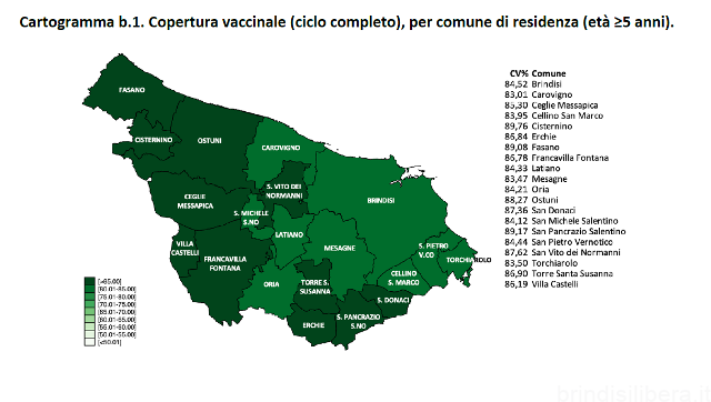 Fino al 23 febbraio i residenti o domiciliati in provincia di Brindisi vaccinati con la prima dose sono 334.267, di questi 317.032 con la seconda dose e 232.691 con la terza dose, con una copertura vaccinale pari rispettivamente al 90,6%, all’86% e al 67,3%. La copertura vaccinale con la prima dose relativa ai residenti con più di 80 anni di età è pari al 98,7%, al 96,3% per il ciclo completo e all’84% per la terza dose. I residenti di età compresa tra 5 e 11 anni vaccinati con prima dose risultano essere 12.799 per una copertura vaccinale pari al 56,1%.