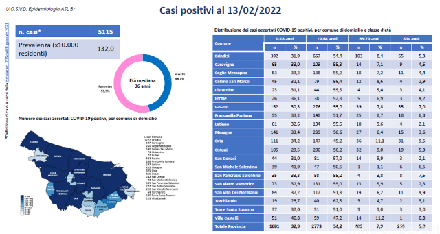Per quanto riguarda la distribuzione per Comune i positivi sono 1.227 a Brindisi, 502 a Fasano, 422 a Mesagne, 356 a Ostuni, 325 a Oria, 286 a Francavilla Fontana, 250 a Ceglie Messapica, 226 a San Vito dei Normanni, 222 a San Pietro Vernotico, 197 a Carovigno, 187 a Latiano, 142 a San Donaci, 140 a Cellino San Marco, 125 a Villa Castelli, 105 a San Pancrazio Salentino, 100 a Torre Santa Susanna, 93 a San Michele Salentino, 74 a Cisternino, 72 a Erchie, 64 a Torchiarolo. I Comuni della provincia di Brindisi con i maggiori valori di incidenza cumulativa sono, nell’ordine, Torchiarolo, Oria, Brindisi, Cellino San Marco.