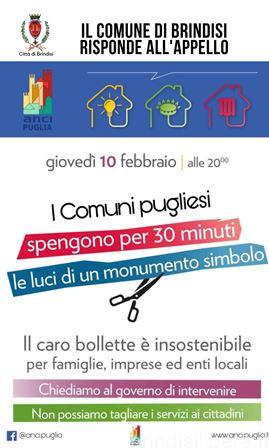 Il Comune di Brindisi aderisce all’appello del presidente dell’Anci nazionale Antonio Decaro e del presidente dell’Anci Puglia Domenico Vitto “Luci spente nei comuni”, spegnendo il 10 febbraio alle ore 20, per la durata di mezz’ora, le facciate di Palazzo Granafei-Nervegna e del Nuovo Teatro Verdi.