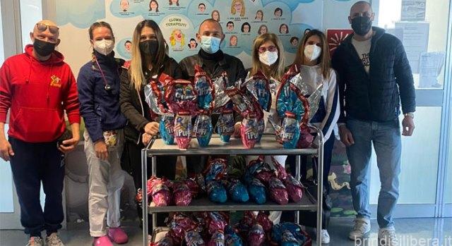 Una delegazione di Uniti per lo sport insieme al maestro Carmine hanno donato, attraverso i responsabili dell’Unità Operativa di Pediatria del Presidio Ospedaliero “Di Summa-Perrino” di Brindisi, un uovo di Pasqua a testa per ogni bambino che sarà costretto a trascorrere tra le corsie ospedaliere il giorno che ricorda la resurrezione di Gesù e le altre festività di questo periodo dell’anno che per molti rappresentano motivo di gioia.
