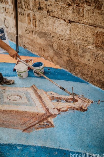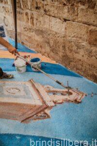Con lo sguardo rivolto verso il basso si attraverseranno simboli identitari della comunità come l’acqua, rappresentata con fasce blu e celesti, per poi incontrare gli ulivi e le spighe di grano. Il tutto in un abbraccio ideale con la Torre Civica, Castello Imperiali e le maioliche della cupola della Basilica Minore del Santissimo Rosario.