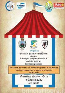 Come il Rione Judea ( uno dei quattro rioni di Oria), che ha organizzato, per mercoledì 3 agosto, a partire dalle 20.30, l’ evento percorso enogastronomico , artistico e musicale, “ Cena nel quartiere ebraico medievale “.