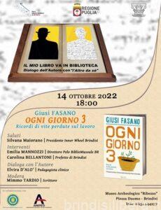 Nell’ambito della rassegna culturale “Il mio libro va in biblioteca. Dialogo dell’autore con l’Altro da sé”, organizzata dal Polo BiblioMuseale di Brindisi, presso il Museo “Ribezzo”, verrà presentato il libro “Ogni giorno 3. Ricordi di vite perdute sul lavoro” di Giusi Fasano.