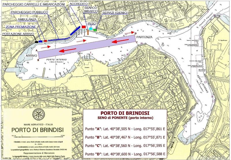 La manifestazione prevede gare di velocità e distanza 500-1000-1500-2000 metri. Annunciata la partecipazione di sette società pugliesi (tre di Brindisi, due di Bari, una di Barletta ed una di Monopoli): LNI Brindisi, Rowing Club Brindisi, VV.FF. Carrino Brindisi, CUS Bari, C.C. Barion Bari, LNI Barletta e C.C. Pro Monopoli. In gara 180 atleti con 34 batterie programmate.