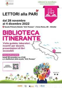 Sul sito di edizioni la meridiana è possibile consultare il calendario completo delle iniziative: incontri con docenti e scolaresche, presentazioni di libri accessibili e molto altro. Le attività andranno avanti fino a domenica 4 dicembre. La Biblioteca Itinerante “Lettori alla Pari” sarà aperta alla visita delle scolaresche, previa prenotazione. Tutti i dettagli dell’iniziativa e il modulo per partecipare sono consultabili a questo link: http://bit.ly/lap_bibliotecaitinerante_brindisi