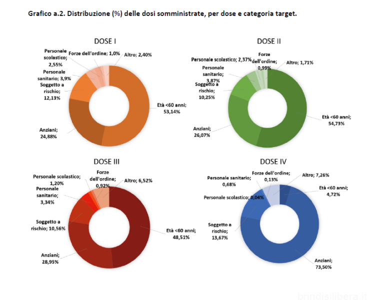 Il 63,9% (611.001) delle dosi è rappresentato da Pfizer, il 23,2% (221.346) da Moderna, il 9% (86.099) da AstraZeneca, il 2,6% (25.006) da Pfizer pediatrico, l’1,3% (12.098) da Janssen e lo 0,01% (88) da Novavax. Il dato delle prime dosi risulta così distribuito: il 53,14% a persone al di sotto dei 60 anni; il 24,88% agli anziani; il 12,13% ai soggetti fragili; il 3,9% al personale sanitario; il 2,55% al personale scolastico; l’1% alle forze dell’ordine; il 2,4% ad altre categorie. Questa la distribuzione delle seconde dosi: per il 54,73% ai soggetti al di sotto dei 60 anni; per il 26,07% agli anziani; per il 10,26% ai soggetti fragili; per il 3,87% al personale sanitario; per il 2,37% al personale scolastico; per lo 0,99% alle forze dell’ordine; per l’1,7% alle altre categorie. Questa, invece, la distribuzione delle terze dosi: il 28,95% agli anziani; il 48,51% a persone al di sotto dei 60 anni; il 10,56% ai soggetti fragili; il 3,34% al personale sanitario; l’1,2% al personale scolastico; lo 0,92% alle forze dell’ordine; il 6,53% alle altre categorie. Questa, infine, la distribuzione delle quarte dosi: il 73,50% agli anziani; il 13,67% ai soggetti fragili; lo 0,04% al personale scolastico; lo 0,68% al personale sanitario; lo 0,13% alle forze dell’ordine; il 4,72% ai soggetti al di sotto del 60 anni; il 7,26% alle altre categorie.