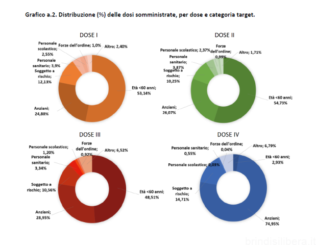 Secondo l’ultimo report a cura dell’Unità operativa di Epidemiologia del Dipartimento di Prevenzione della Asl Brindisi, dal 27 dicembre 2020 al 23 novembre 2022 sono state somministrate 956.836 dosi di vaccino, di cui 342.456 prime dosi, 332.247 seconde dosi, 260.737 terze dosi e 21.296 quarte dosi; mediamente, sono state somministrate 1.495,06 dosi per giornata di vaccinazione.