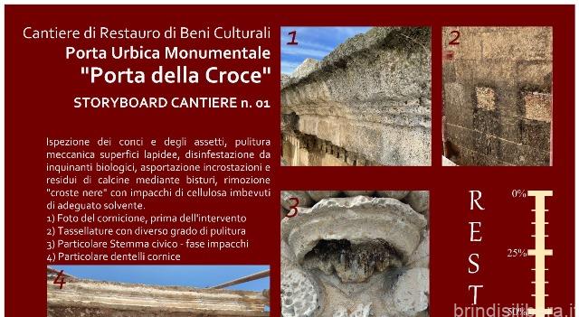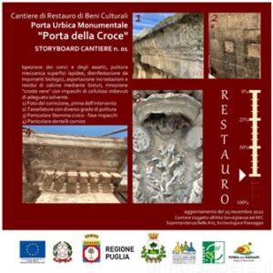 Prosegue l’intervento di restauro della Porta della Croce programmato dall’Amministrazione comunale. La squadra di restauratori, guidata da Maria Buongiorno, sta completando gli interventi sulla superficie lapidea con la pulitura, la disinfestazione da inquinanti biologici, l’asportazione delle incrostazioni, l’eliminazione dei residui di calcine e la rimozione delle “croste nere”.