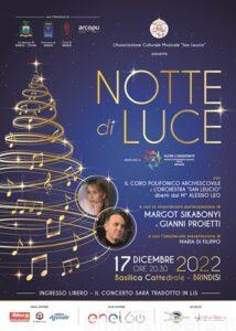 L’Associazione musicale-culturale “S. Leucio”, con la collaborazione dell’associazione Arcopu (Associazione Regionale dei Cori Pugliesi), con il patrocinio dell’Arcidiocesi di Brindisi-Ostuni, del Comune di Brindisi, della Provincia di Brindisi, con il media partenariato del quotidiano online www.brindisitime.it, la radio, Idea Radio nel Mondo e del settimanale, Agenda Brindisi e con il sostegno di Enel, l’Agenzia “Pamela Viaggi”di Ostuni (BR) e “La Vie en Rose” di Brindisi, presenta il 17 dicembre 2022, alle ore 20:30, presso la Basilica Cattedrale di Brindisi, il concerto di Natale, dal titolo “Notte di Luce”. Ritorna il tradizionale concerto natalizio del Coro Polifonico Arcivescovile “San Leucio” e dell’Orchestra “San Leucio”, diretti dal M° Alessio Leo, per celebrare con gioia l’attesa del Natale. Nel trentesimo anniversario della fondazione del Coro Arcivescovile, ci condurranno nella notte più luminosa di tutte dove anche le stelle danzano e annunciano la nascita del Redentore. La narrazione è liberamente ispirata al romanzo di Sergio Bambarèn “Notte di luce”, da cui il titolo del concerto. La storia sacra si intreccia con una favola per condurci in una dimensione altra in cui musica, parole, sogno e realtà si fondano per prepararci al Natale. In un dialogo continuo tra coro, orchestra e racconto si dipaneranno i brani della tradizione popolare italiana tra cui, “Tu scendi dalle stelle”, “Joy to the world” insieme a tanti altri, interpretati dal coro e dell’orchestra “San Leucio”, ma anche da Gianni Proietti, primo tenore della diocesi di Roma. A tessere il racconto la delicata interpretazione di Margot Sikabonyi, attrice italiana, nota al grande pubblico per il ruolo di Maria Martini nella serie televisiva “Un medico in famiglia”, che con la sua eterea presenza ci condurrà in questa dimensione onirica accanto alle stelle. Il coro, da sempre sensibile ai temi della solidarietà e della speranza, quest’anno dedicherà il concerto alla cooperativa sociale “Oltre l’Orizzonte” di Brindisi Il concerto sarà presentato dalla giornalista, Maria Di Filippo e sarà tradotto in LIS. Il Coro Polifonico Arcivescovile e l’Associazione Musicale-Culturale “San Leucio”, colgono l’occasione per augurare a tutta la cittadinanza un sereno Natale ed un felice anno nuovo.