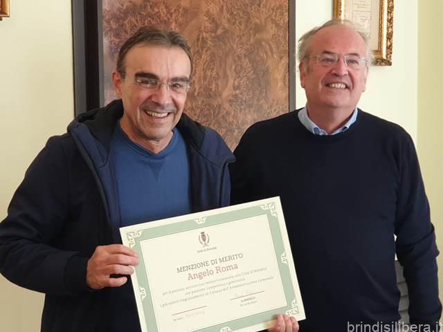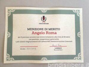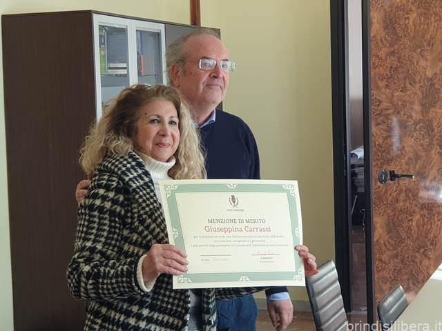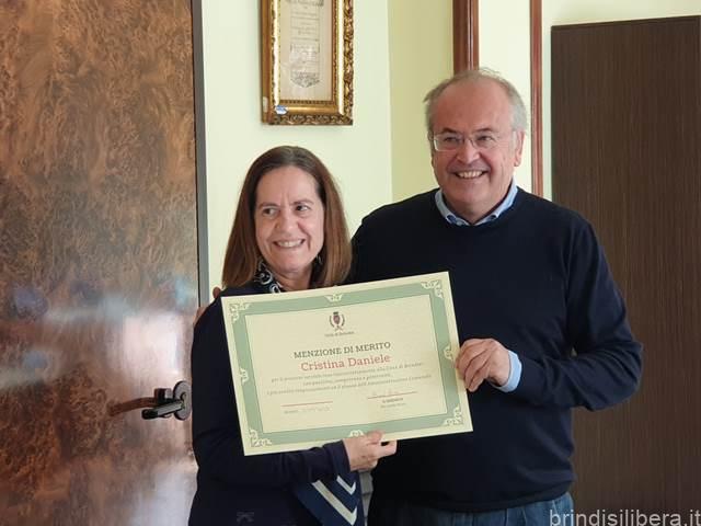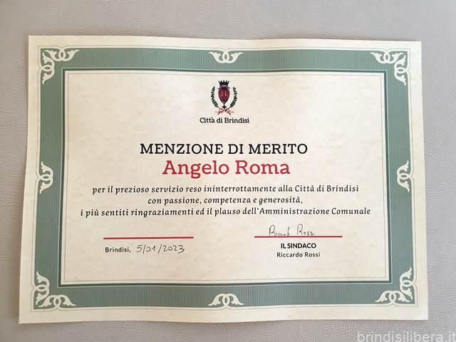 L’attestato riporta la seguente motivazione “Menzione di Merito per il prezioso servizio reso ininterrottamente alla città di Brindisi, con passione, competenza e generosità, i più sentiti ringraziamenti ed il plauso dell’amministrazione comunale”.