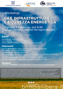 Si discuterà di tali temi nel corso del Workshop promosso dal DiTNE, in collaborazione con Confindustria e CNA Brindisi, sul tema “GAS, INFRASTRUTTURE E SICUREZZA ENERGETICA” che si terrà a Palazzo Nervegna in Brindisi il prossimo 7 febbraio e di cui si allega programma: nel corso dell’evento interverranno rappresentanti istituzionali nazionali e regionali, esperti, esponenti di alcune delle principali aziende ed associazioni nazionali del settore energetico.