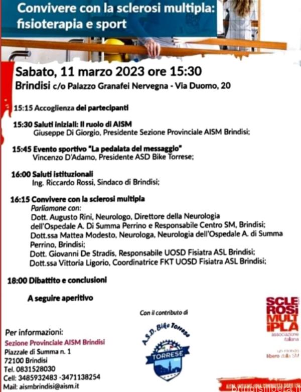 Inoltre, Vi sarà, la partecipazione del Presidente Aism Brindisi Giuseppe Di Giorgio, il quale illustrerà le attività svolte dalla Sezione su tutto il territorio provinciale, mentre, il Presidente ASD Bike Torrese Vincenzo D’ Adamo, racconterà come è nato il Progetto “La Pedalata Del Messaggio” e il motivo per cui quest’ anno hanno scelto Aism con lo scopo di raccogliere Fondi per FISM attraverso il canale di AISM https://donaconme.aism.it/campaign/la-pedalata del-messaggio/