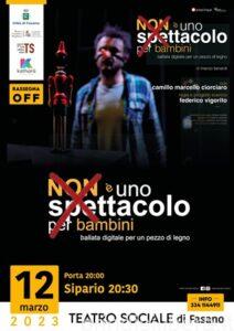 Domenica 12 marzo alle 20:30 “Non è uno spettacolo per bambini – Ballata digitale per un pezzo di legno” inaugurerà la rassegna. La pièce è scritta da Marco Berardi ed è prodotta da Area5 Produzioni e OFFicina OFF.