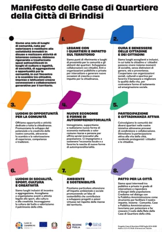 Il Manifesto racconta il presente e allo stesso tempo gli obiettivi futuri. Intende essere uno strumento di lavoro per tutti gli operatori, le associazioni, i cittadini che internamente prendono parte come soggetti attivi alla vita delle Case. È un documento simbolico per la città di Brindisi che attraverso politiche di rigenerazione urbana, punta sul riuso e la rifunzionalizzazione del suo patrimonio immobiliare. Le case di Quartiere sono beni culturali di interesse storico, beni confiscati alla mafia, spazi inutilizzati in quartieri di periferia, accumunati da voler essere “case” per la comunità, luoghi di inclusione ed esempi di come la pubblica amministrazione possa collaborare con i soggetti privati al raggiungimento del benessere collettivo per essere più vicina ai cittadini.