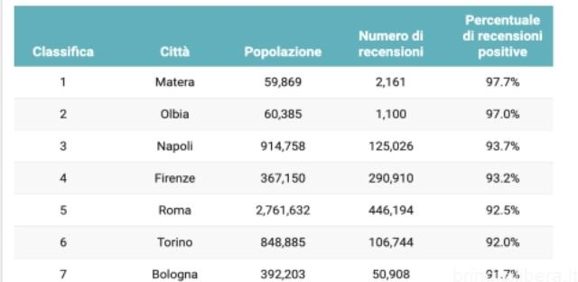 Anche se alcune città hanno ricevuto più recensioni positive di altre l’analisi dei dati dimostra che la maggior parte dei visitatori apprezza le città del Bel Paese. Anche le città che hanno ricevuto la percentuale più bassa di recensioni positive hanno comunque colpito positivamente i turisti: all’ultimo posto della classifica troviamo Pescara, le cui valutazioni positive sono comunque superiori al 75%, Acireale, che ha ricevuto quasi il 76% di recensioni positive e Livorno, apprezzata dal 76% dei visitatori.