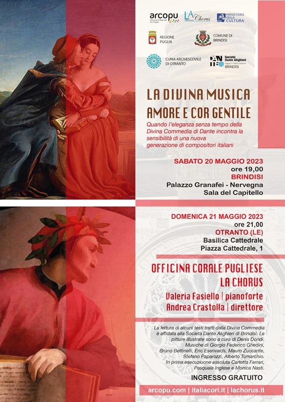 Questi luoghi ospiteranno il concerto “ Amor e Cor gentil “ di L.A. Chorus e l’Officina Corale Pugliese interamente dedicato alla Divina Commedia. Il concerto diretto da Andrea Crastolla con l’accompagnamento pianistico di Valeria Fasiello presenta un programma in cui le sette composizioni risultate vincitrici al Concorso di Composizione Nazionale di ARCoPu, dedicato a Dante, si coniugheranno con brani del repertorio polifonico italiano ed europeo del novecento e contemporaneo. Il presidente di ARCoPu, Pierfranco Semeraro, ha scelto Brindisi e le sue Colonne Romane in omaggio a Virgilio compagno del Poeta nella “selva oscura” ed Otranto ed il suo Mosaico Pavimentale. Virgilio non è solo morto a Brindisi, ma ne è stato un frequentatore essendo un importante centro romano di collegamento con il Mediterraneo. Otranto si lega a Dante tramite il mosaico pavimentale di Pantaleone terminato un secolo prima della nascita di Dante ma che recenti studi e pubblicazioni ne mutuano analogie simboliche con la Commedia dantesca. Il Comune di Brindisi e la Curia Arcivescovile di Otranto hanno accolto con entusiasmo la proposta artistica che già nel novembre scorso presso i concerti del MarTa a Taranto ha affascinato il pubblico. Il direttore del coro, Andrea Crastolla, ha dunque ordinato il programma secondo le categorie della Divina Commedia in cui risuoneranno le composizioni di Stefano Paparozzi e Alberto Tomarchio, già eseguite al MarTa di Taranto nello scorso novembre, ed in prima esecuzione assoluta quelle di Carlotta Ferrari, Pasquale Inglese e Monica Nasti.