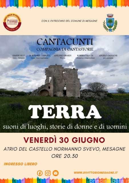 Nell’ambito del programma E_state con la Di Vittorio, venerdì 30 giugno si terrà il concerto di musica popolare dei Cantacunti, Atrio del Castello comunale ore 20.30. La compagnia di cantastorie festeggia 25 anni di attività con lo spettacolo “TERRA suoni di luoghi, storie di donne e di uomini”. I Cantacunti sono: Gianni Vico, voce e chitarra; M. Rosaria Coppola, voce e voce narrante; Antonio Libardi, flauto; Roberto Bascià, chitarra e mandolino; Angelo Gaglione, percussioni. Nel consolidato stile della compagnia, che pone la narrazione come fulcro della performance, “Terra” è un viaggio nel quale i sentieri dei canti tradizionali si intrecciano con quelli di ballate inedite dalla forte radice popolare. L’iniziativa è patrocinata dalla città di Mesagne ed è sostenuta da FLC CGIL Brindisi e da Tenute Lu Spada. Ingresso libero