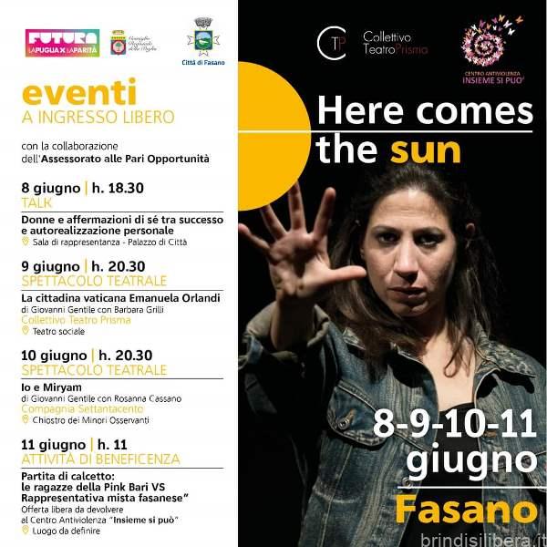 Un ciclo di quattro appuntamenti gratuiti, un fine settimana di eventi tra teatro civile, dibattiti, riflessione e sport. Perché il sole arriva sempre a sorgere oltre ogni tempesta della vita. Si chiama «Here comes the sun», come la canzone dei Beatles, che significa, appunto: «Ecco che arriva il sole», ed è il titolo del calendario di manifestazioni promosso dal Collettivo teatro Prisma in collaborazione con l’assessorato alle Pari Opportunità. Il sole che arriva è quello che portano nelle donne con la luce con cui illuminano la quotidianità.
