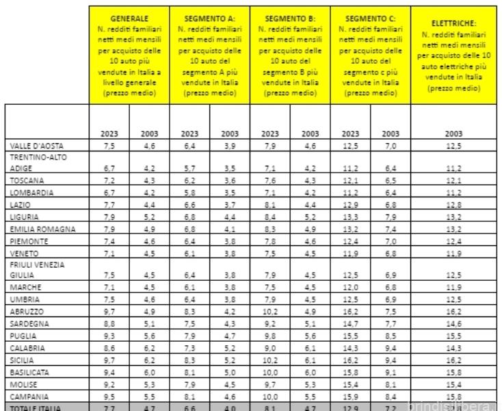 Per acquistare una vettura nuova, nel 2023 una famiglia in Puglia deve spendere in media 9,3 redditi netti medi mensili rispetto ai 5,6 di 20 anni fa. Per l’elettrico la media è di 15,5 mensilità.