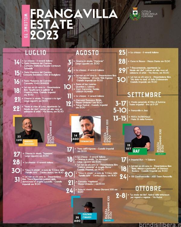 “In poche settimane – spiega il Sindaco Antonello Denuzzo – abbiamo preparato un cartellone ricco di suggestioni con nomi di primo piano della scena musicale. Avere sul palcoscenico di Piazza Giovanni XXIII artisti come Vecchioni, Finardi, Tiromancino, Raf e i migliori interpreti della scena jazz è fonte di orgoglio per ogni francavillese, oltre ad essere un prestigioso biglietto da visita per la Città.”