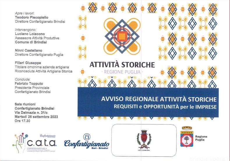Si terrà martedì 26 settembre alle ore 17.30 in Confartigianato Brindisi l’incontro pubblico sul Bando della Regione Puglia denominato ATTIVITA’ STORICHE.