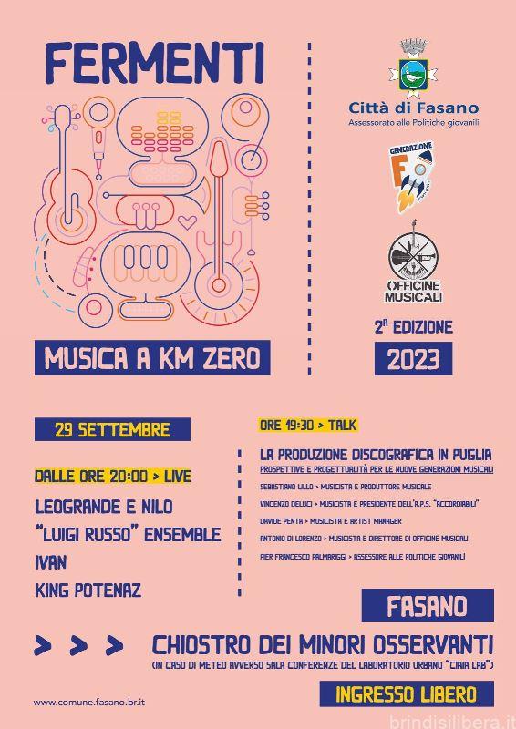 (musicista e direttore di Officine Musicali) e Pier Francesco Palmariggi (assessore alle Politiche Giovanili della città di Fasano). Si prosegue alle 20.30 con la musica: il duo ‘Leogrande & Nilo’, due cantautori fasanesi che faranno ascoltare il loro ultimo disco intitolato “Punto e virgola” e registrato a Londra negli “Smoke House Studios”. «Sono anni che questa passione ci porta a vivere e sognare! – dicono i due giovani artisti – Speriamo di farlo anche insieme a voi!». Di seguito si esibirà il ‘Luigi Russo Ensemble’: gli alunni del Liceo Musicale “L.Russo” presenteranno “80 Fever”, un medley di grandi successi tutti da ballare. La sezione Educational del festival Fermenti si rivolge ai giovanissimi musicisti che, pur non avendo ancora pubblicato materiale originale, sono già in cammino verso una presenza attiva nella scena musicale, elaborando creativamente e professionalmente materiale preesistente. Poi sul palco salirà ‘Ivan’, artista emergente della scena urban italiana che si distingue per l’utilizzo del dialetto assieme all’italiano in un brano che vuole comunicare l’esperienza dell’artista e la vita di provincia, tra caparbietà e voglia di migliorarsi. Cerca di coinvolgere l’ascoltatore, anche se può non comprendere del tutto il testo, proprio come accade con le varie hit estere, che riescono comunque a trasmettere emozioni e a far entrare l’ascoltatore nel mood, pur senza la comprensione totale delle lyrics. Concludono il festival i ‘King Potenaz’, nati nel 2019 durante alcune jam session, amici e musicisti di vecchia data e attivi nella scena heavy underground locale. Nel 2022 pubblicano “Among The Ruins” e “Pyramids Planet” (demo version). Il 28 aprile 2023 vede la luce il loro album d’esordio “Goat Rider”, distribuito da Argonauta Records.