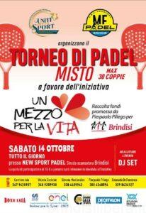 Tutto pronto per il Torneo di Padel di beneficenza in programma sabato 14 ottobre presso i campi della Asd “New Sport Padel” promosso dalla A.S.C.R. “Uniti per lo Sport” di Brindisi per raccogliere fondi per il progetto “Un mezzo per la vita” in favore di Ail Brindisi