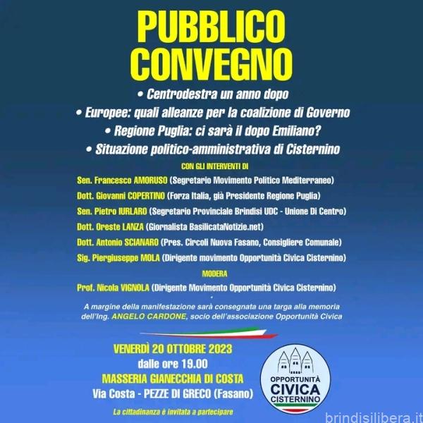 Venerdì 20 Ottobre 2023, a partire dalle ore 19, il movimento Opportunità Civica Cisternino organizza un pubblico convegno incentrato su diverse tematiche politiche di livello locale e nazionale.