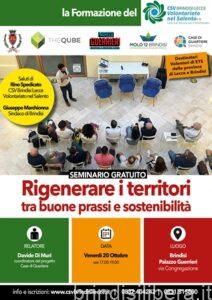 Proseguono gli appuntamenti formativi del CSV Brindisi-Lecce “Volontariato nel Salento”, che promuove per venerdì 20 ottobre (ore 17,00-19,00) un seminario gratuito dal titolo “Rigenerare i territori tra buone prassi e sostenibilità”, in programma a Brindisi presso Palazzo Guerrieri (via Congregazione).