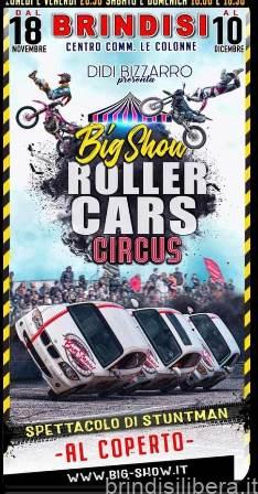 A Brindisi abbiamo il piacere di presentare per la prima volta assoluta il Big Show ROLLER CARS Circus. Uno spettacolo capitanato da Didi Bizzarro e i suoi collaboratori che si svolgerà completamente al coperto. La famiglia Bizzarro è alla quarta generazione di praticanti di questo mestieri. Nell’area parcheggio del Centro Commerciale “Le colonne” se ne incontreranno diversi.
