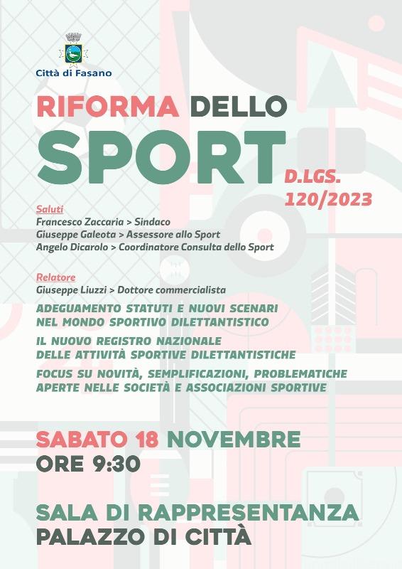 Si svolgerà sabato 18 novembre, alle ore 9:30 nella Sala di rappresentanza di Palazzo di Città, l’incontro sul tema Riforma dello Sport – D.LGS. 120/2023.