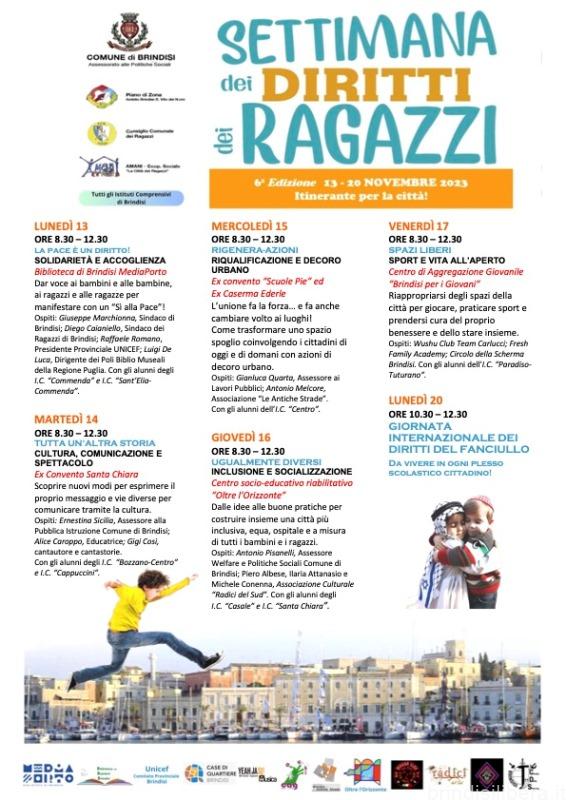 Il programma della Sesta edizione della Settimana dei Diritti dei Ragazzi accompagna il Consiglio Comunale dei Ragazzi, i Consigli Scolastici e intere classi, in una esperienza itinerante per tutta la città di Brindisi, per far vivere alcuni dei luoghi cittadini rivolti alle giovani generazioni (MediaPorto, Case di Quartiere, parchi, spazi associativi e di accoglienza) insieme ad ospiti appartenenti al mondo delle Istituzioni, educatori, insegnanti ed esperti.