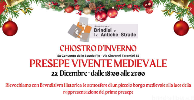 Il 22 dicembre dalle 18:00 alle 21:00 – a fare da contorno al presepe medievale che riproporrà il Presepe di Greccio, ideato da San Francesco nell’Anno Domini 1223 – vi sarà l’Associazione Brvundisvm Historica che rievocherà le antiche arti e gli antichi mestieri del XIII secolo.