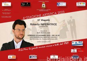 Prosegue domenica 10 dicembre, alle 18.30, presso l’Auditorium della Scuola Musicale Comunale di Francavilla Fontana, la Stagione Artistica “I concerti dell’Auditorium”, organizzata dall’Associazione A.Gi.Mus. di Francavilla Fontana e dall’Associazione Auditorium di Castellana Grotte, sotto la direzione artistica dei maestri Pierluigi Camicia e Antonio Curto. A salire sul palco Roberto Imperatrice, pianista d’eccellenza, che proporrà un repertorio basato su musiche di Bach, Brahms, Liszt.