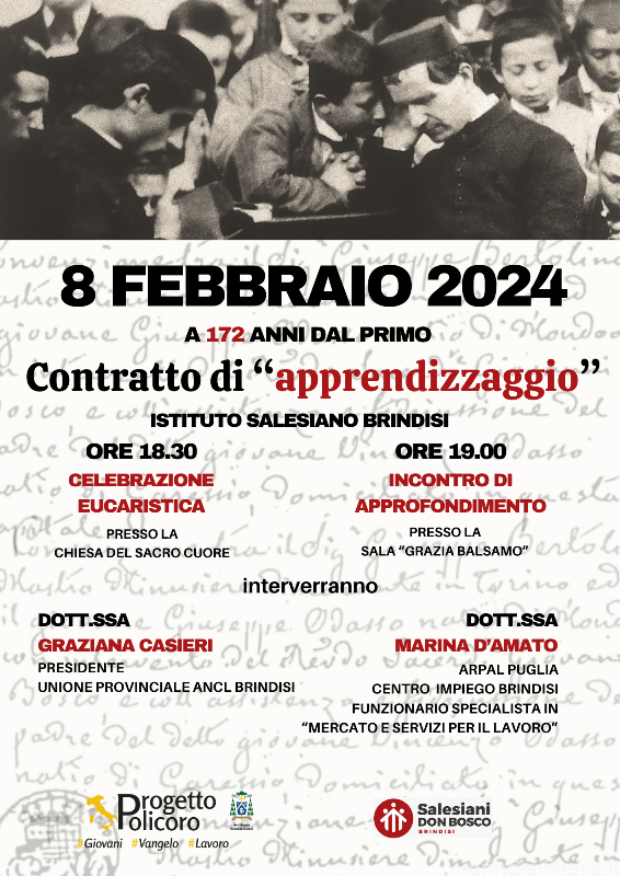 Come ogni anno il Progetto Policoro dell’Arcidiocesi di Brindisi-Ostuni condivide con i Salesiani di Brindisi un momento di preghiera, riflessione e informazione in occasione del 172esimo anniversario dalla sigla del primo contratto di apprendistato, voluto da don Bosco, tenutasi l’8 febbraio del 1852. L’incontro si terrà alle ore 19 presso la Sala Grazia Balsamo dell’Istituto Salesiano. Interverranno la dott.ssa Graziana Casieri, presidente dell’ANCL UP Brindisi e la dott.ssa Marina D’Amato, funzionario presso l’ARPAL Puglia – Centro per l’Impiego di Brindisi. La riflessione sarà preceduta alle ore 18.30 dalla SS Messa.