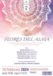 Domenica 18 febbraio alle 19.00, il Teatro Sociale di Fasano diventerà l’abitacolo di una nave chiamata «Flores del alma», per un viaggio musicale nelle calde atmosfere dell’America Latina. Dal bolero al tango, passando per il son cubano e la musica tradizionale messicana, sulle strade di quelle sonorità che da sempre caratterizzano l’America Latina.