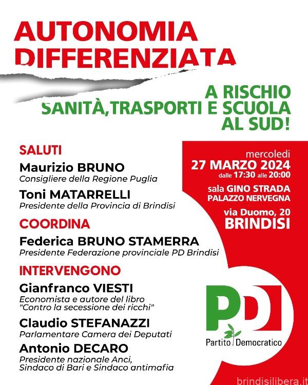 Si discuterà degli effetti del disegno di legge ‘spacca Italia’ mercoledì 27 marzo a partire dalle ore 17.30 nella sala “Gino Strada” di Palazzo Nervegna a Brindisi con il consigliere regionale Maurizio Bruno, il Presidente della Provincia Toni Matarrelli, la Presidente della Federazione Provinciale Pd Federica Bruno Stamerra, l’economista e autore del libro “Contro la secessione dei ricchi” Gianfranco Viesti, il parlamentare Pd Claudio Stefanazzi e il Presidente nazionale Anci, Sindaco di Bari e Sindaco antimafia Antonio Decaro.