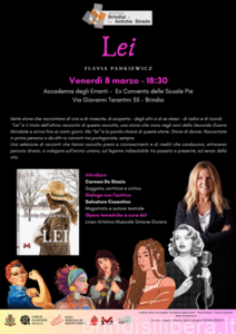 L’incontro si terrà, in occasione della giornata internazionale delle donne, venerdì 8 marzo alle ore 18:30, presso la Sala Conferenze dell’Accademia degli Erranti, in Via Giovanni Tarantini 35 – Ex Convento delle Scuole Pie (1°Piano) , dove a cura dell’ente gestore, avremo il piacere di presentare il libro “LEI”, di Flavia Pankiewicz.Sette storie che raccontano di crisi e di rinascite, di scoperta – degli altri e di se stessi – di radici e di ricordi.