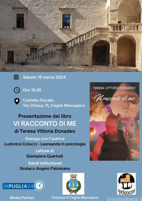 Sabato 16 Marzo 2024 segna un evento per gli amanti della letteratura e della cultura a Ceglie Messapica. Alle ore 18.30, nella suggestiva cornice del Castello Ducale situato in Via Chiesa 11, avrà luogo la presentazione del libro “Vi racconto di me” di Teresa Vittoria Donadeo.