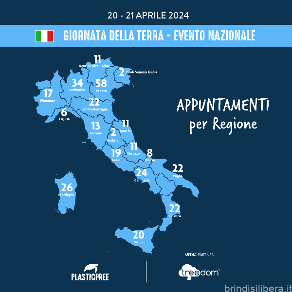Il maggior numero di appuntamenti si terrà in Veneto (58), Lombardia (34), Sardegna (26), Campania (24), Emilia-Romagna, Puglia e Calabria (22) e Sicilia (20). Poi Lazio (19), Piemonte (17), Toscana (13), Abruzzo, Trentino-Alto Adige e Marche (11) Molise (8), Liguria (6), Umbria e Friuli-Venezia Giulia (2).
