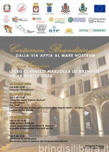 Bari; il Prof. Onofrio Vox, Professore emerito di Lingua e Letteratura Greca, dell’Università del Salento e la Prof.ssa Tiziana Ragno, Professoressa di Lingua e Letteratura Latina, dell’Università di Foggia. La stessa sottoporrà un brano di un autore latino che abbia parlato dell’ager Brundisinus o che in esso abbia descritto e ambientato episodi della storia romana. Contemporaneamente, tavola rotonda presieduta dal Dirigente Scolastico, Prof.ssa Carmen Taurino, per i docenti accompagnatori delle varie delegazioni scolastiche: alcune classi del Liceo Classico “Marzolla” e alcuni alunni del Liceo Musicale “Durano” saranno in auditorium: i primi per trattare alcuni interventi inerenti al tema Brindisi e il mare, i secondi per sviluppare la tematica nel linguaggio universale della musica, con contributi di pregio da parte degli ensemble del Liceo Musicale, diretti dai Proff. Danilo Leo e Antonio Bagnato. Nel pubblico, alcune classi del “Marzolla” con i loro docenti e gli affezionati amici del Liceo. Vari gli sponsor del Certamen “Dalla Via Appia al Mare Nostrum”: Intesa Sanpaolo; Tenute Al Bano; Curia Arcivescovile di Brindisi Ostuni; Stf land & sea survey, Società di Topografia srl. Numerose anche le istituzioni che hanno concesso il patrocinio morale, segno di una sinergia maturata in questi anni tra vari soggetti attorno al Certamen. Prestigiosi i relatori: lo storico prof. Giacomo Carito, il giornalista dott. Angelo Sconosciuto, il presidente del Circolo della Vela di Brindisi dott. Gaetano Caso. Dalla Brindisi di età romana e le sue vie del mare alla Brindisi accogliente dei profughi giunti dal mare alla navigazione in vela alla volta di Corfù, in quella Grecia che con Brindisi ha sempre avuto legami culturali profondi. Un viaggio tra cultura, promozione anche economica del territorio salentino, parte orientale d’Italia protesa verso i più orientali tra gli Europei: i Greci.